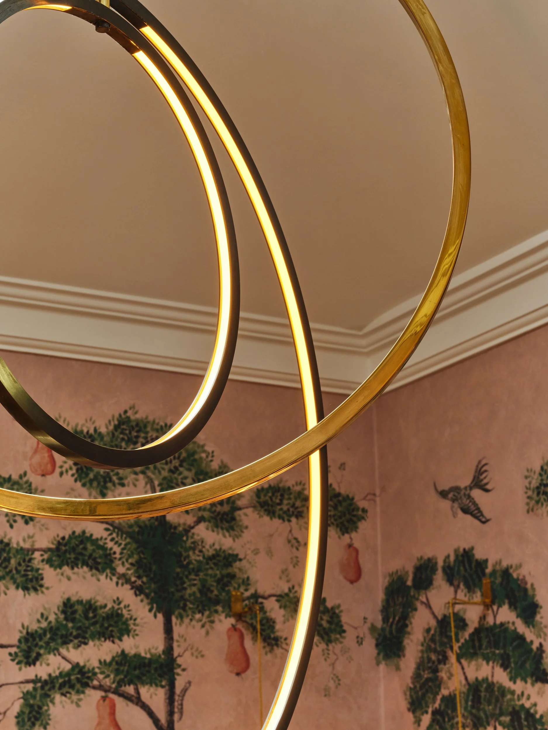 Brass details linked to the Droplet lights, designed very simple brackets so they would appear to blur the wallpaper and reality.