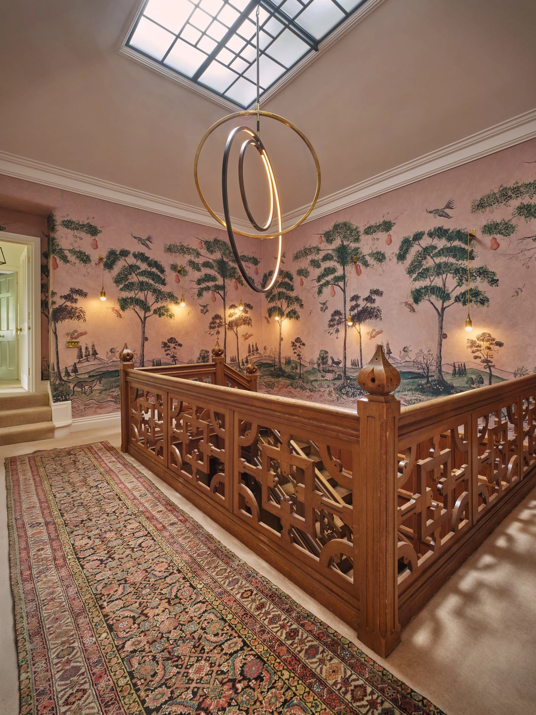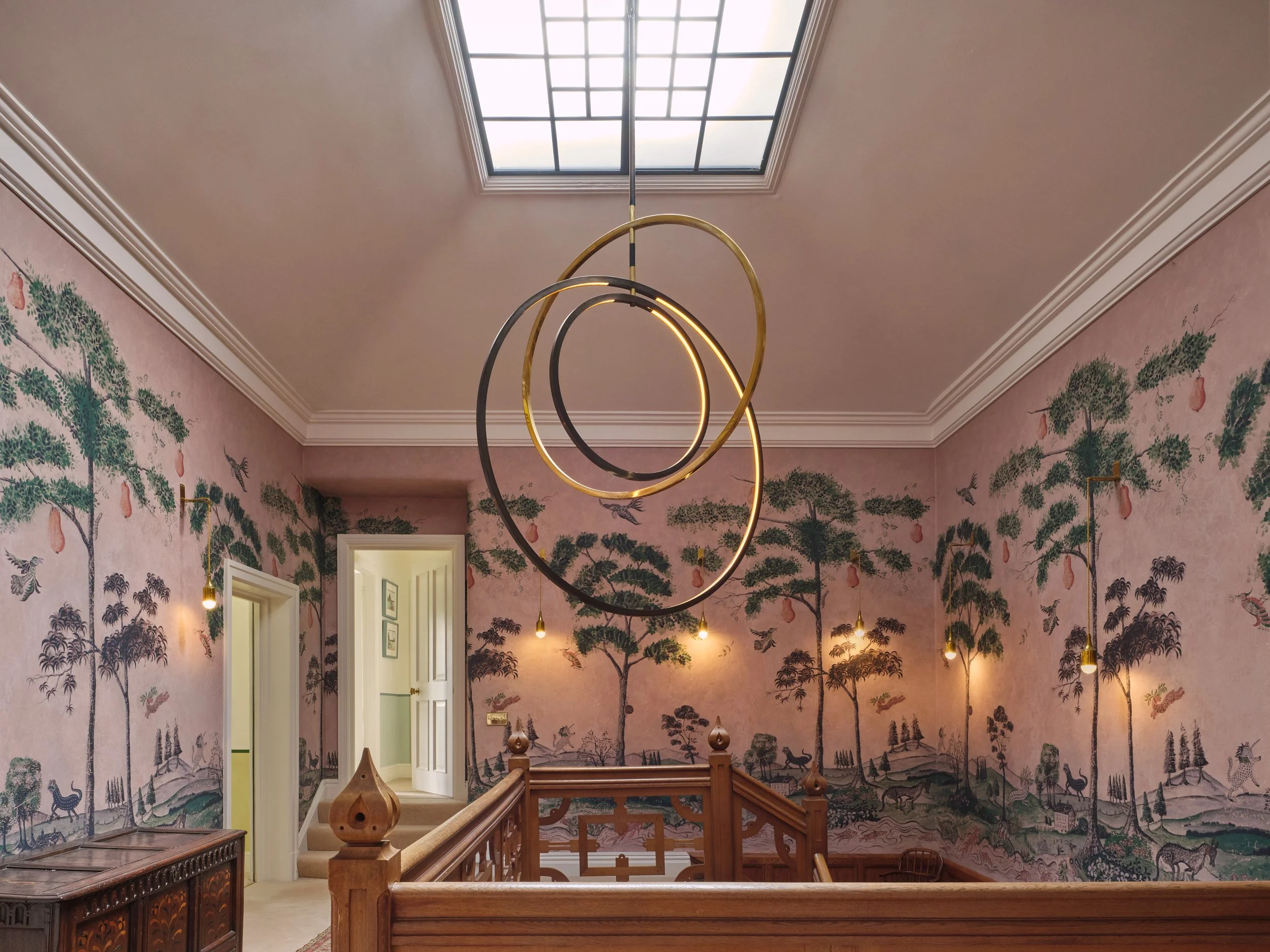 Links to the skylight above and fits within the space whilst also filling the void, delicate and playful, giving warm soft light through out the day and into the evening.
